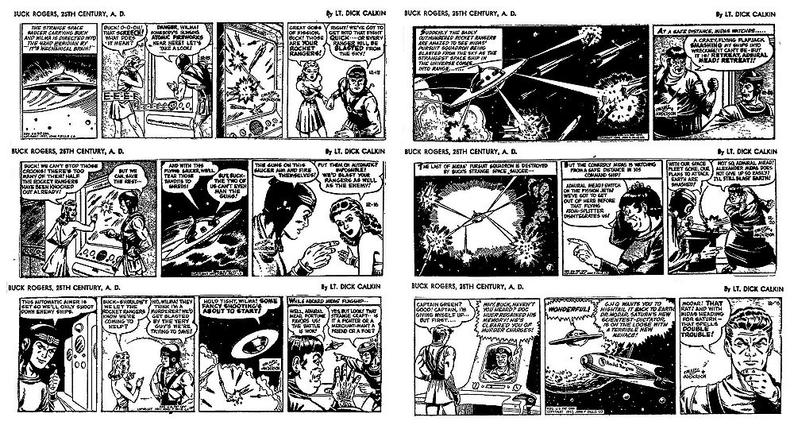 Buck Rogers, with own flying saucer and mechanical brain-controlled atomic ray-guns, blasts apart invading bandit fleet of rocket ships from Saturn and saves his Rocket Rangers fleet. [Note: This is apparently the comic strip Buck Rogers cartoonist Dick Calkin was referring to back in July when he wrote a letter to a Chicago newspaper, tongue-in-cheek apologizing for creating the flying saucer scare.]