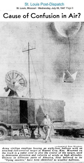 RADAR KITE. An army civilian employee at Kansas City, Kan., looses an eight-foot balloon with an attached foil-covered radar target. Mounted on the truck is a radar cone to plot the course of the target, used to check wind direction and velocity. Army officials believe people have been mistaking this apparatus as a mysterious "flying disc." (Associated Press Wirephoto) (St. Louis Star and Times, July 9, 1947, p. 9)