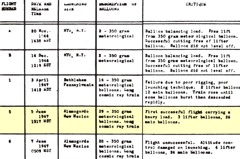 :Footnote 18. "The first research balloon flight of any sort at Holloman had been slightly earlier, 5 June 1947; this involved a cluster of rubber-type balloons (interview, Mr. Gildenberg by Dr. Bushnell, 18 September 1957).”