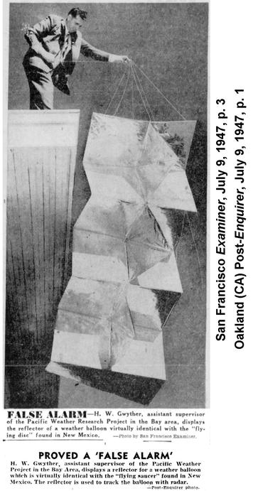 (First to reach him, The Examiner got a complete description of the "disc" from him, together with his expressed suspicion that it was just part of a weather balloon. His description tallied with that of radar reflectors sent up with weather balloons every day at Oakland.