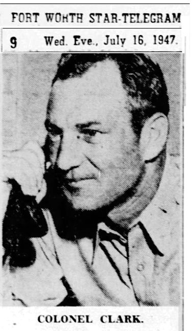 A week later, on Sunday July 6, Ramey was attending an air show in his home town of Denton, Texas, as was FWAAF base commander. Col. H. T. Wheless [Note 2 -- Wheless' background] (Denton Record-Chronicle, Fort Worth Star-Telegram, July 6). His chief of staff, Brig. Gen. Thomas Dubose (Ret.) remembered Ramey being away from the base when Dubose received the first calls from acting SAC chief Gen. Clemence McMullen in Washington about the crash and strange material being found. (This probably represented debris samples that rancher Mack Brazel had brought to the sheriff's office when he first reported his find.) McMullen ordered the debris immediately shipped to Washington by "colonel courier" under the strictest secrecy. Dubose wasn't even supposed to tell the absent Ramey while McMillan figured out what to do. As it turned out, according to Dubose, acting base commander Col. AlAN D. Clark ended up as McMullen's "colonel courier." [See Note 2A on Col. Clark becoming new FWAAF C/O 10 days later]